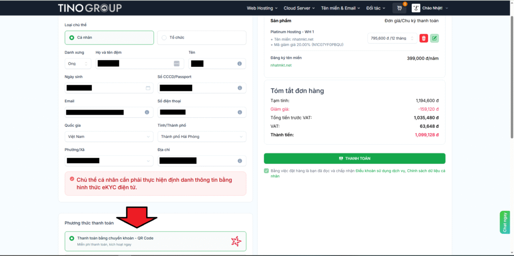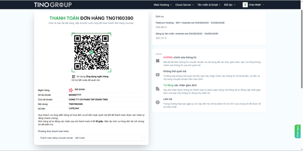 5. Bước 5: Điền thông tin cá nhân, chọn phương thức thanh toán và hoàn tất. TinoHost sẽ gửi thông tin quản trị hosting về email của bạn trong vài phút.